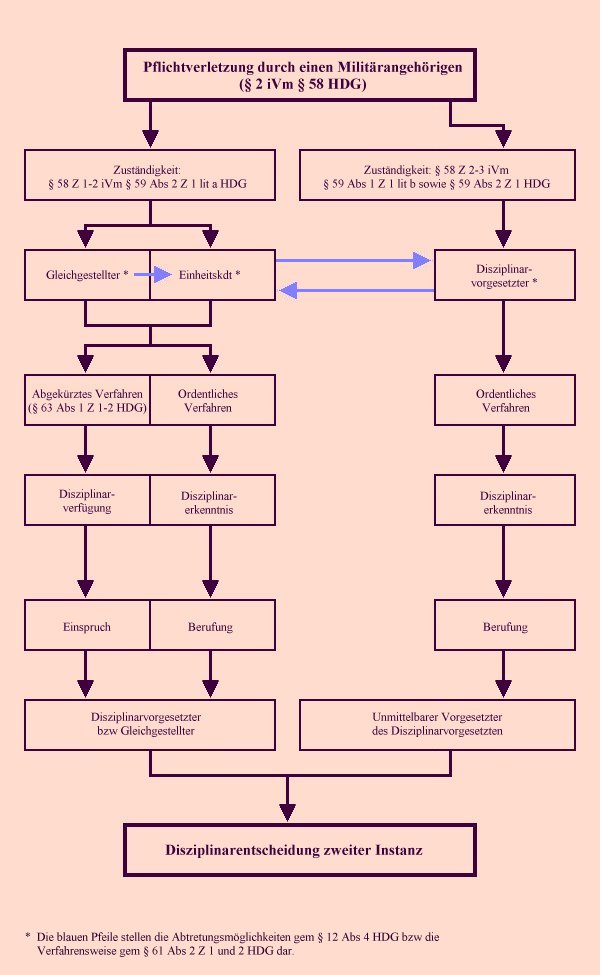 In erster Instanz sind für die disziplinäre Ahndung soldatischer Pflichtverletzungen,[272] die von den in § 58 Z. 1–3 HDG genannten Personen[273] begangen werden, die Einheitskommandanten sowie die ihnen gleichgestellten Personen[274] zuständig. Einheitskommandanten sind „Offiziere, denen der Befehl über eine Einheit übertragen ist.”[275] Ihre disziplinäre Gewalt erstreckt sich ausschließlich auf Soldaten, die ihrer Befehlsgewalt unterstellt sind. Außerdem ist die Strafbefugnis auf Soldaten beschränkt, die im Vergleich zu ihnen einen niedrigeren Dienstgrad haben.[276] Die Disziplinargewalt soll möglichst vom unmittelbaren beziehungsweise sachlich und rangmäßig angemessenen Vorgesetzten ausgeübt werden.[277] Sind daher sowohl der Einheitskommandant als auch ein ihm Gleichgestellter im Sinne von § 12 Abs. 1 Z. 1–3 HDG aufgrund der ihnen übertragenen Befehlsgewalt zur Entscheidung berufen,[278] gilt der Letztgenannte als Disziplinarbehörde.[279] Steht dem der gleiche oder höhere Dienstgrad des Beschuldigten entgegen, ist der nächsthöhere Vorgesetzte des Gleichgestellten als ein dem Einheitskommandanten Gleichgestellter Disziplinarbehörde.[280]